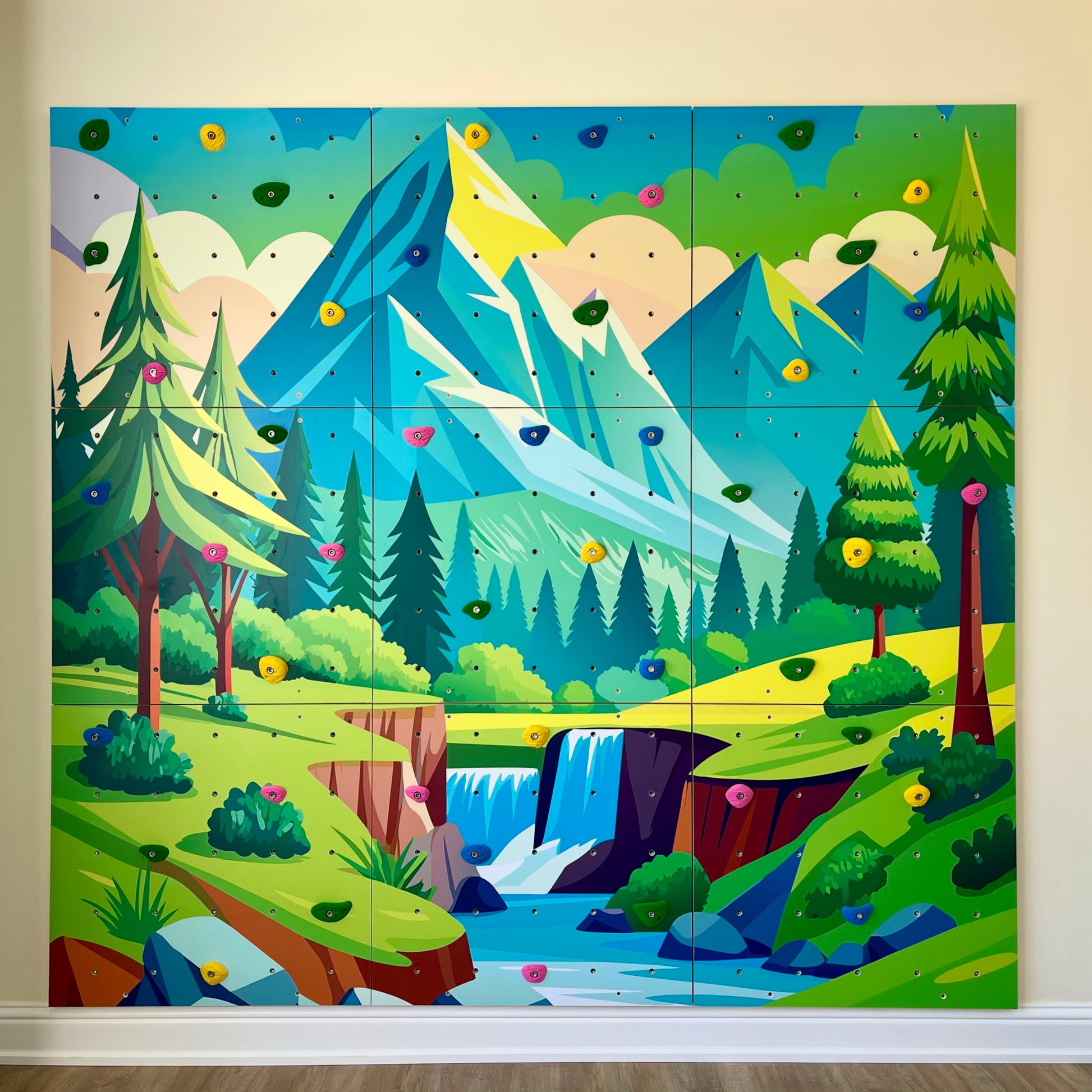 This playroom equipment creates the perfect kids' activity center, featuring a mountain-themed design and a complete wall mount system that turns any space into a stimulating and engaging play area for children.
